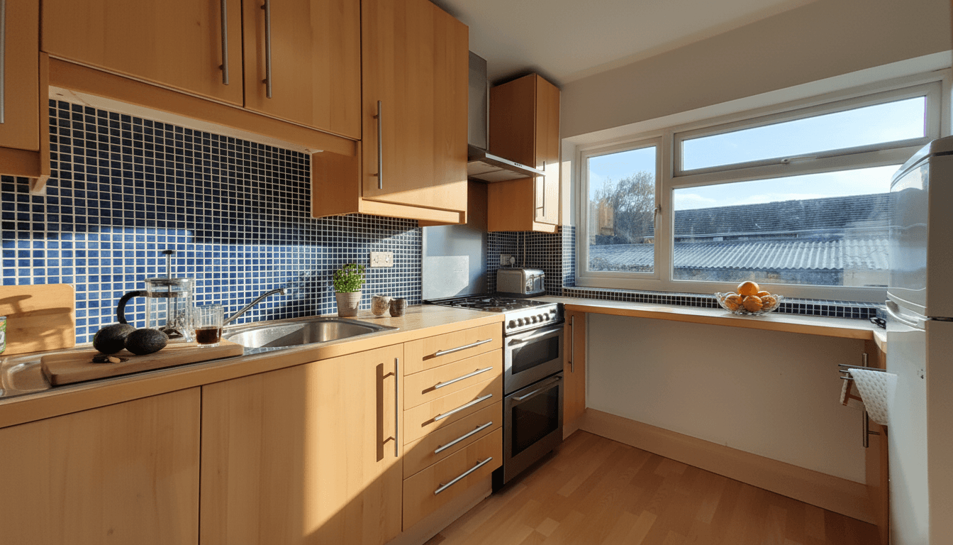 The modern fitted kitchen offers ample storage and worktop space and is well laid out for everyday use.
